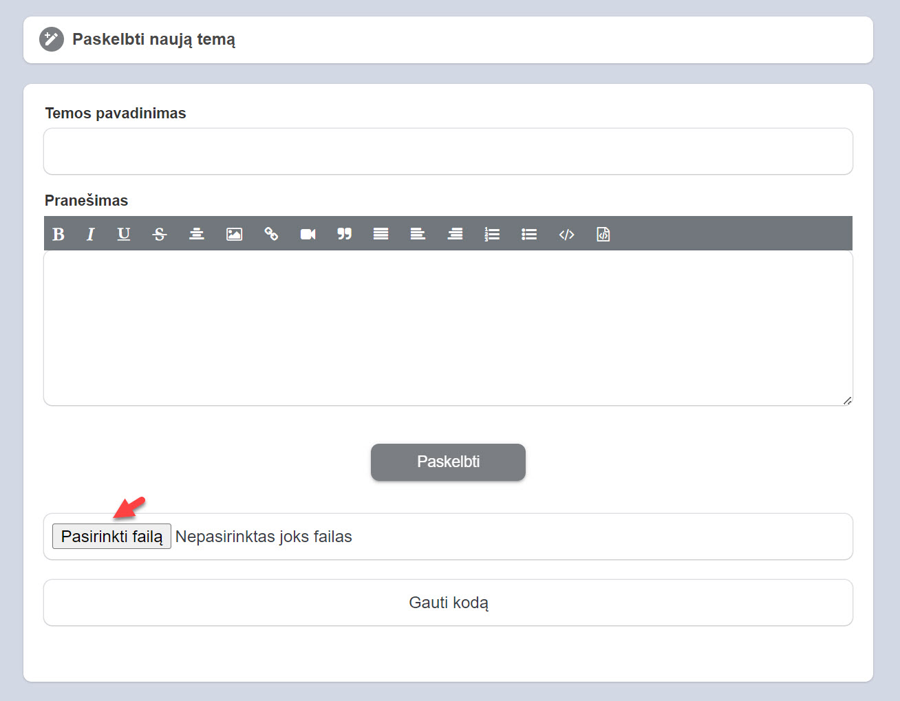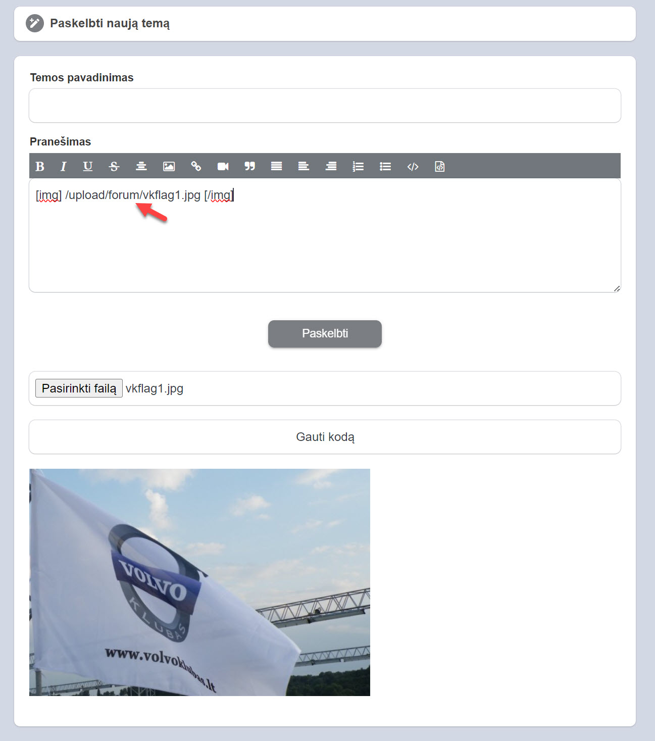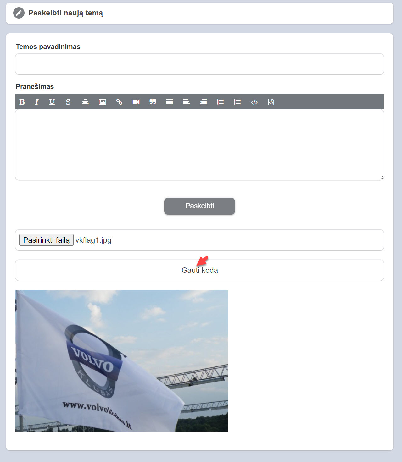 Nuorodą patalpiname pranešimo langelyje. Štai ir viskas. Spaudžiame paskelbti, prieš tai įrašę temos pavadinimą ir papildę pranešimą tekstu.